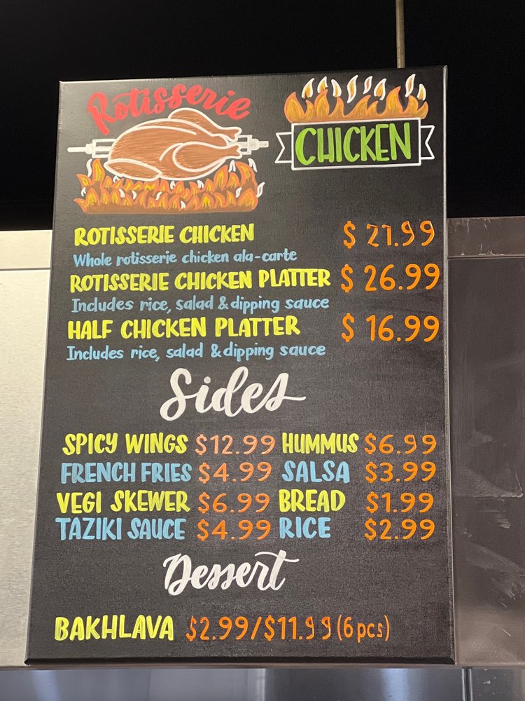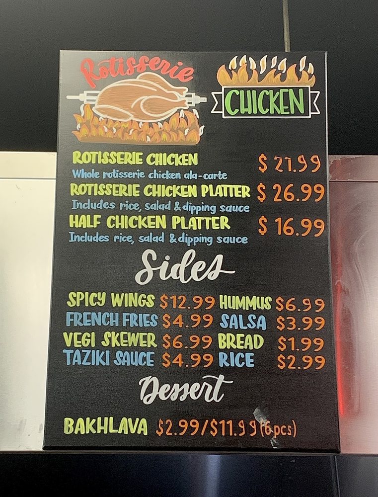 The menu isn't just for carnivores; it caters to everyone with vegan and kosher options available. Don't miss the 1/2 Chicken Platter, served with fluffy rice and fresh salad, a delightful and satisfying choice for lunch or dinner.